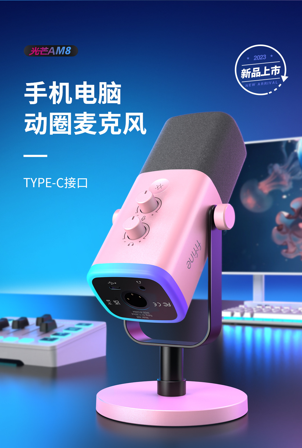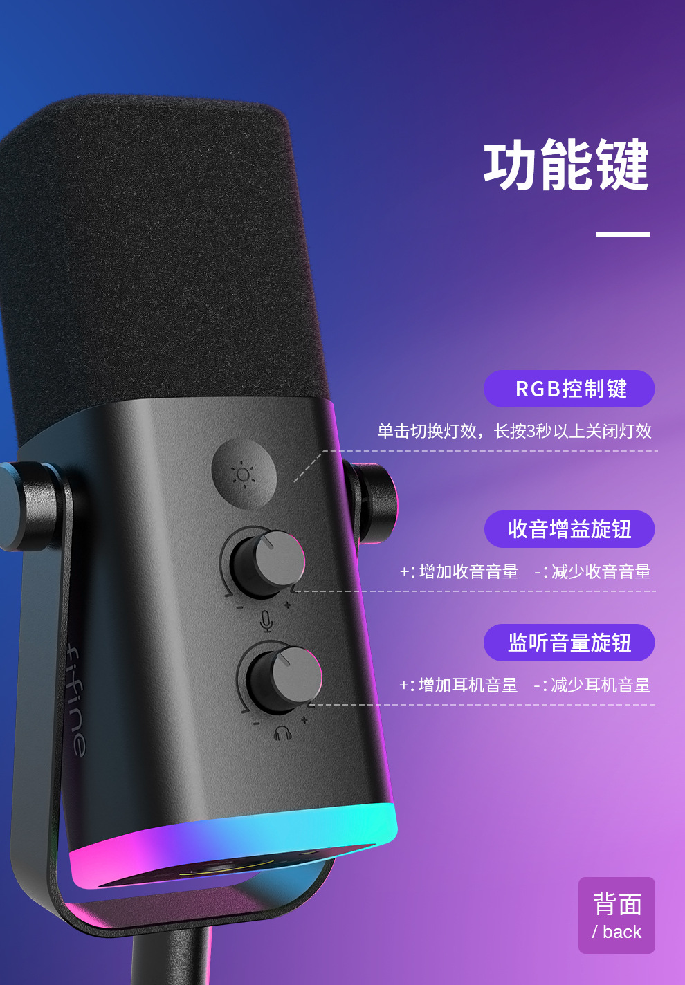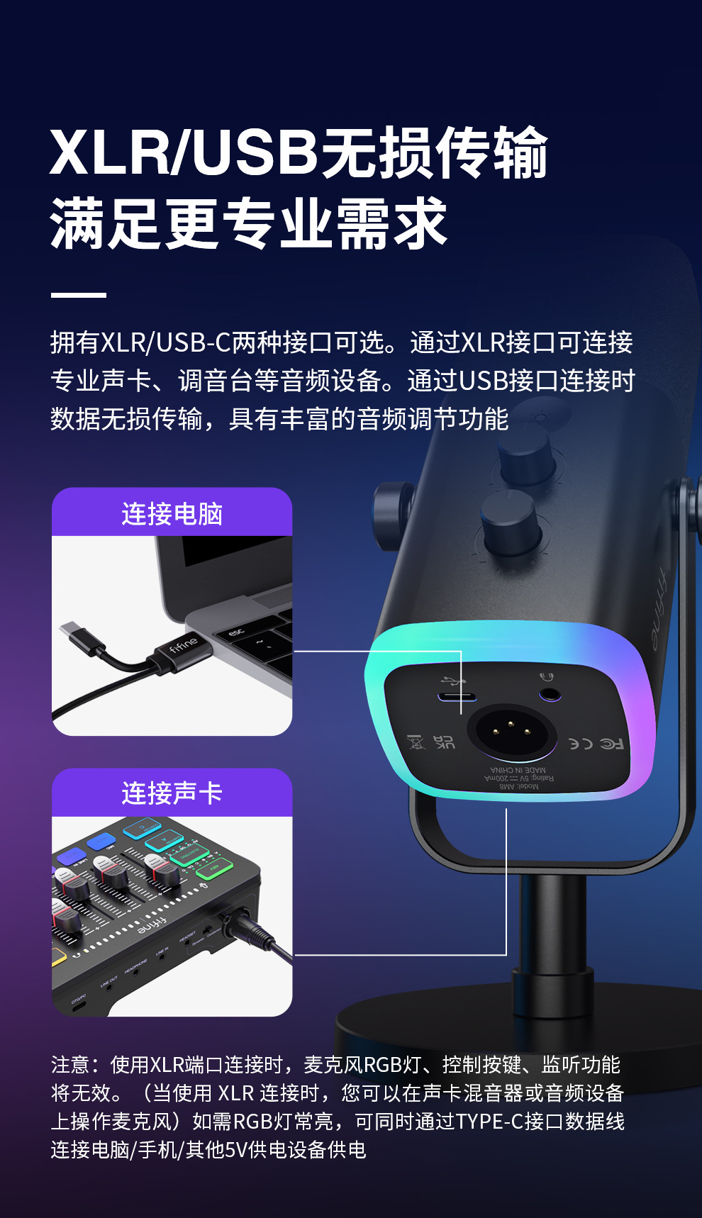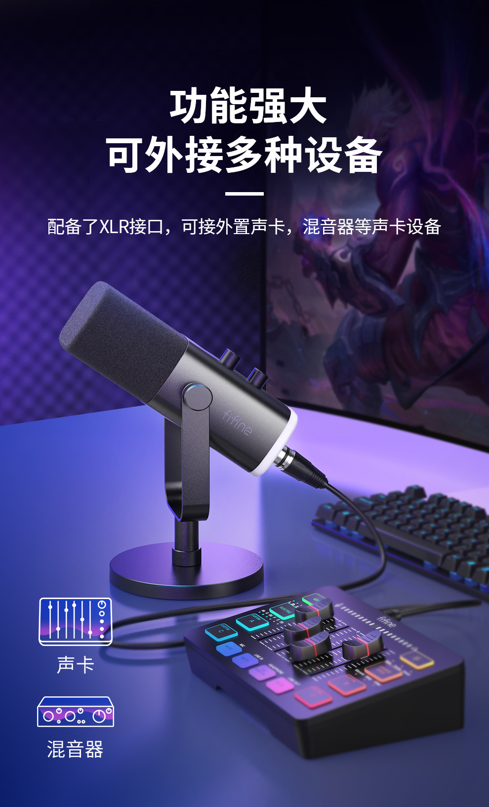 fifine动圈降噪多功能麦克风电脑台式游戏直播录音接声卡RGB麦AM