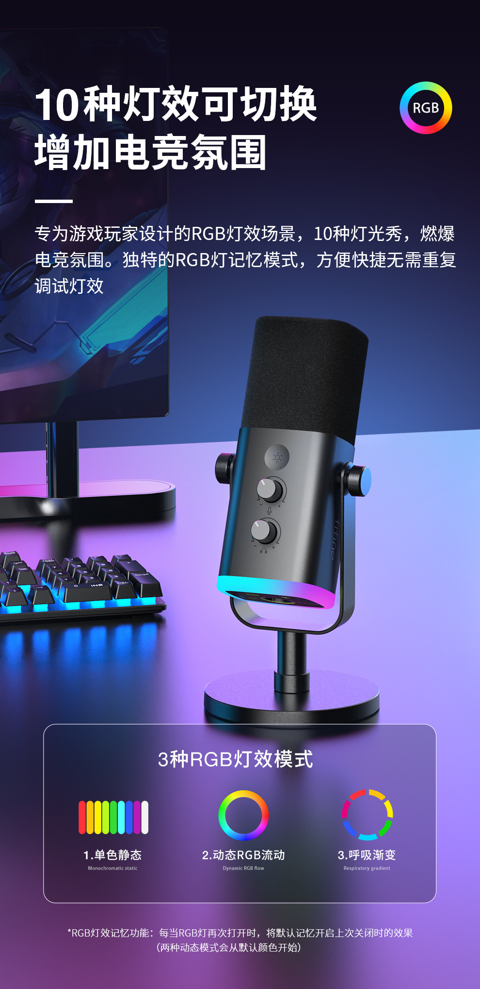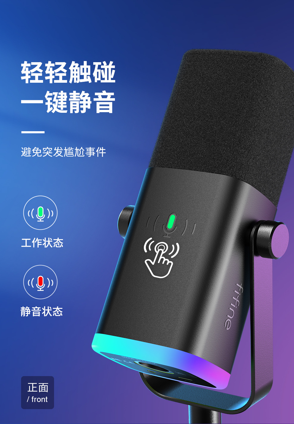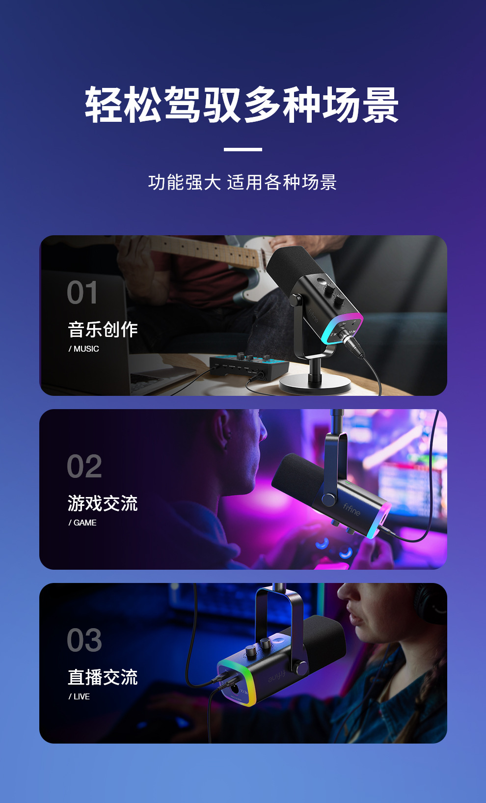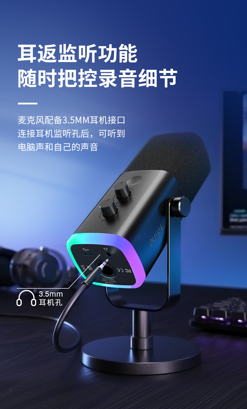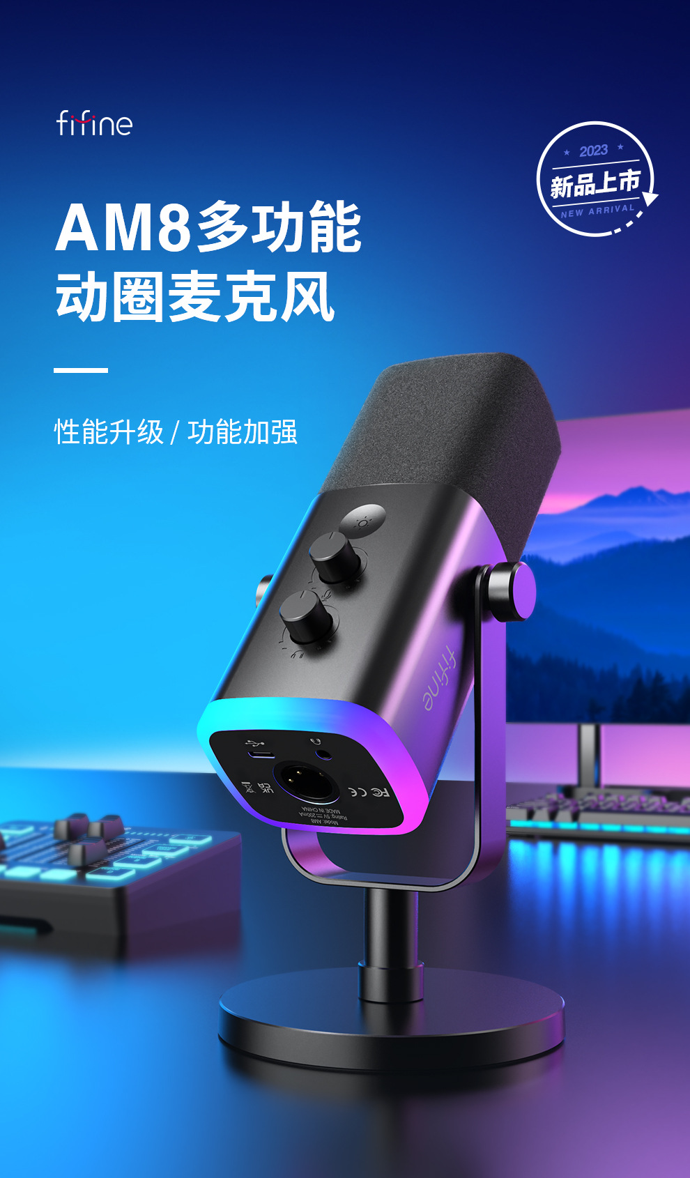 fifine动圈降噪多功能麦克风电脑台式游戏直播录音接声卡RGB麦AM